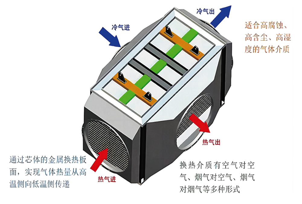 气气换热器又名(双侧宽流道焊接式板式换热器或板式空气换热器)是我司与吸收国内外先进技术与设计理念,近几年研发的一种新型板式热交换器,它由一系列互相平行并压有定距柱的薄金属平板相叠而成,主要由传热板片、外框密封板、压紧装置等组成。